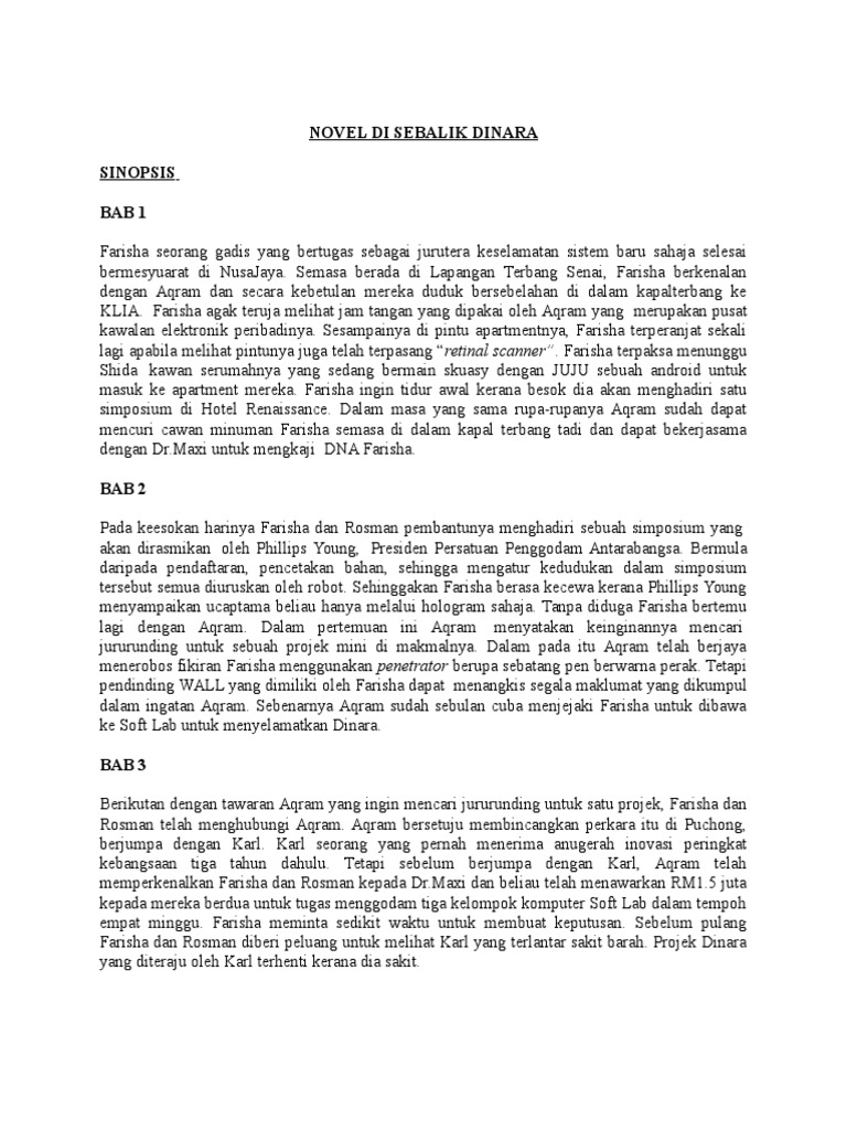 。 sinopsis bab demi bab, tema, persoalan, watak dan perwatakan, latar masa, latar tempat, latar masyarakat, plot, teknik plot, nilai, pengajaran, soalan peperiksaan +. Baca versi flipbook dari novel di sebalik dinara. Sinopsis novel komsas di sebalik dinara keywords: